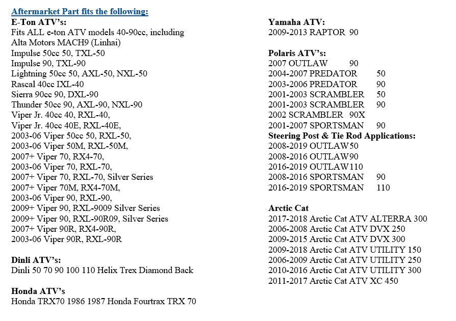 • Steering Post & Tie Rod Applications:                    2008-2019 OUTLAW 50
