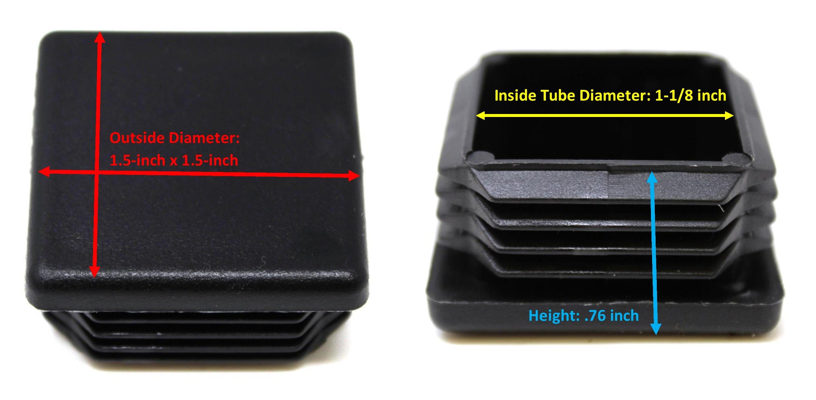 Our JSP Brand Plastic Black 1-1/2 (1.5") inch Square Tubing Cap, Finishing Plugs are heavy duty and durable with a flexible ribbed design for a secure and easy fit. They fit any 1-1/2” outside dimension square opening. Use these universal plugs to give you that finished look on office or patio furniture, wrought iron, appliances, exercise equipment or any tubing with an 1-1/2" (1.5") outside dimension square opening were a clean finished look is desired.